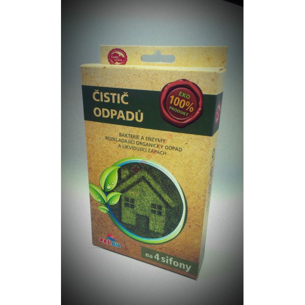 ČISTIČ ODPADŮ, mikrobiologický přípravek určený k likvidaci veškerých organických nánosů (mýdlo, tuky, zbytky potravin, vlasy, vousy apod.) a k zprůchodnění pomalu odtékajících odpadů.