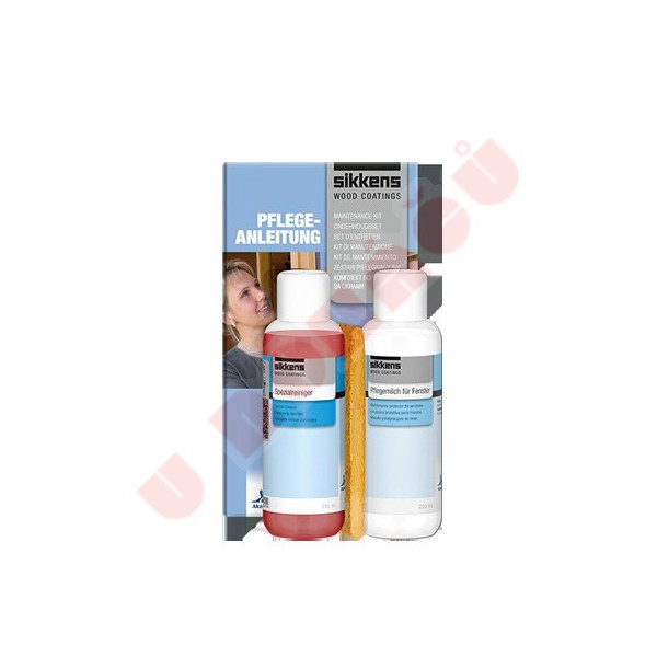 Sada Sikkens Pflegeset ( Maintenance kit gloss ) se používá na pravidelnou údržbu vnějších lakovaných ploch dřevěných oken. Čisticí roztok WV803 Special Cleaner, který je součástí sady, velmi účinně, a přitom šetrně odstraňuje veškeré nečistoty a mikrovrstvy odbouraného laku z povrchu nátěrového filmu. Následná aplikace druhé složky sady, balzámu WV 802 Maintenance Milk , obnoví původní vzhled nátěrového filmu a vzniklá vrstvička účinně chrání povrch laku před vlivy povětrnosti.